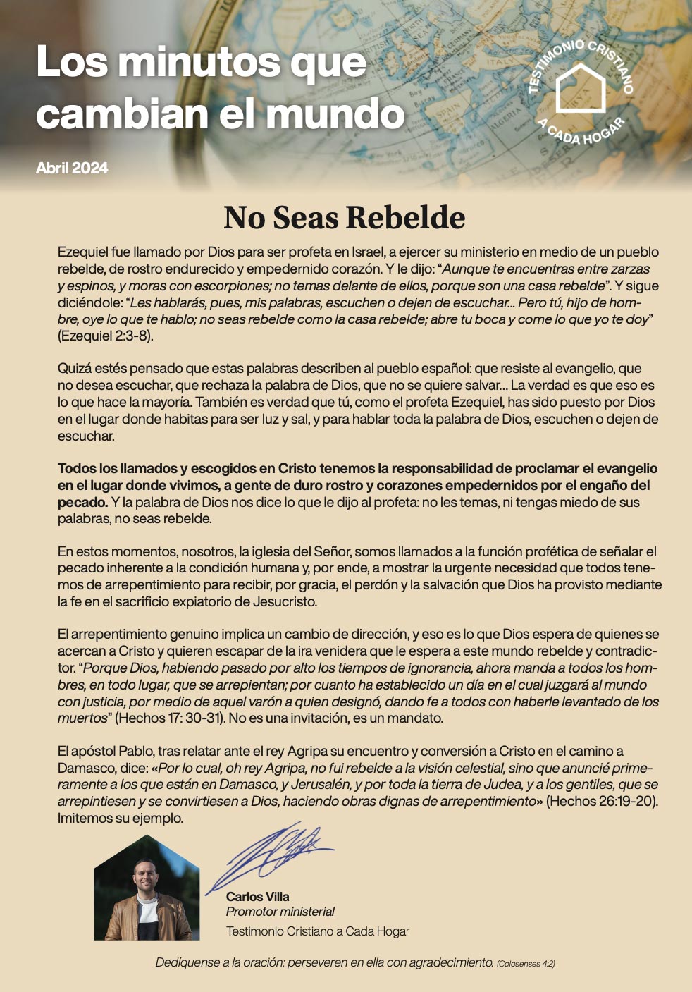 Quizá estés pensado que estas palabras describen al pueblo español: que resiste al evangelio, que no desea escuchar, que rechaza la palabra de Dios, que no se quiere salvar… La verdad es que eso es lo que hace la mayoría. También es verdad que tú, como el profeta Ezequiel, has sido puesto por Dios en el lugar donde habitas para ser luz y sal, y para hablar toda la palabra de Dios, escuchen o dejen de escuchar.